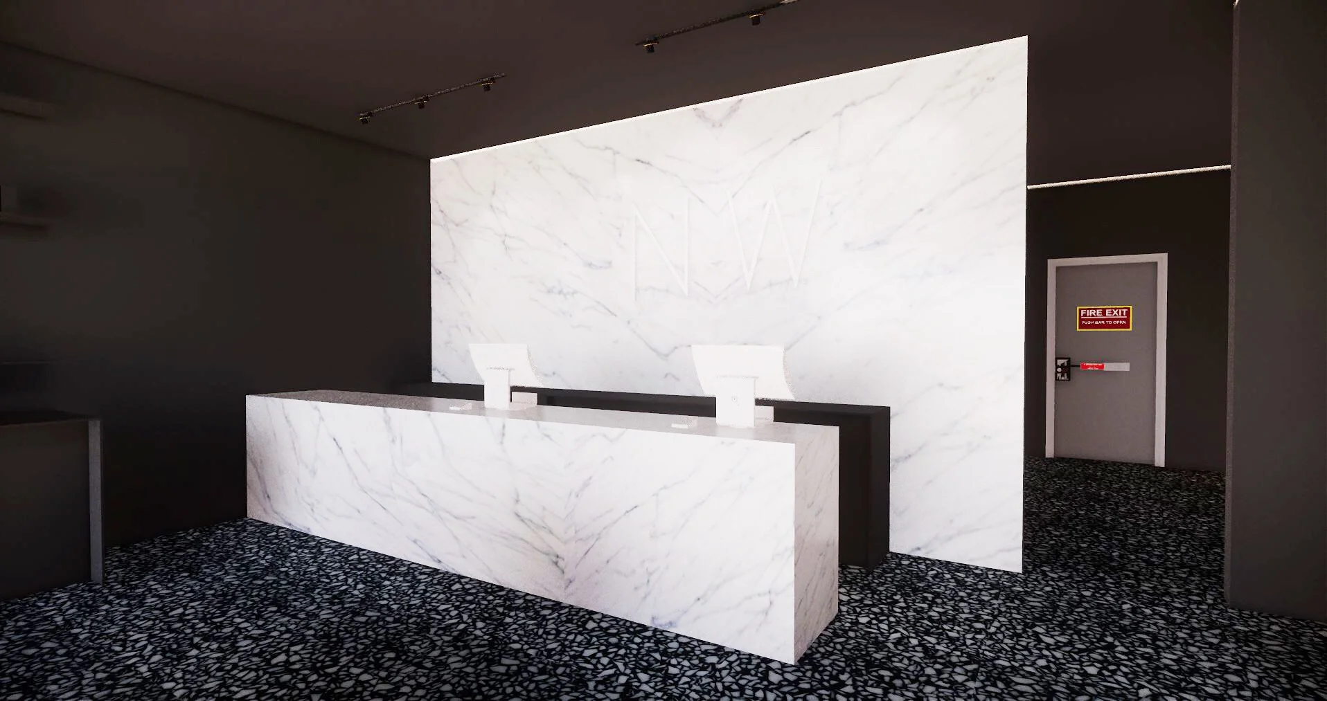The cashwrap area displays the book matched marble technique.