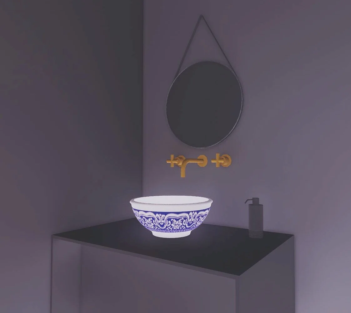 In the bathroom, I found a blue and white porcelain bowl and converted it into a sink.